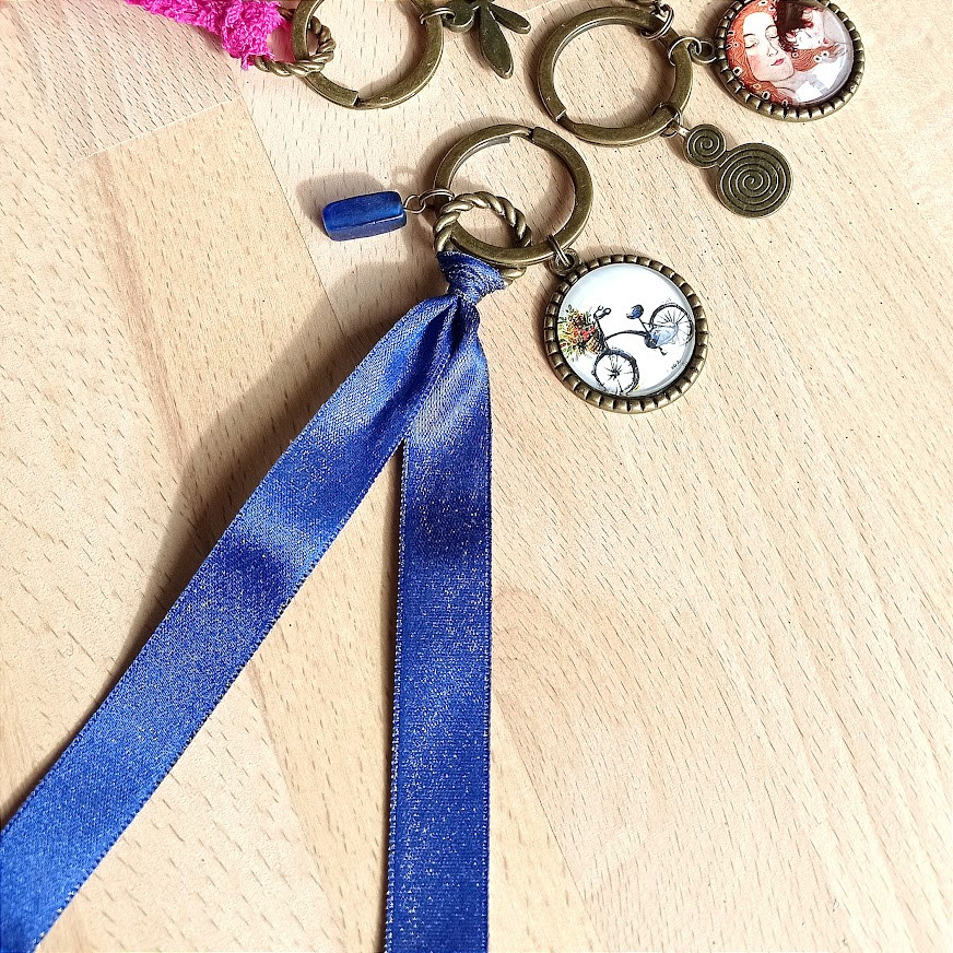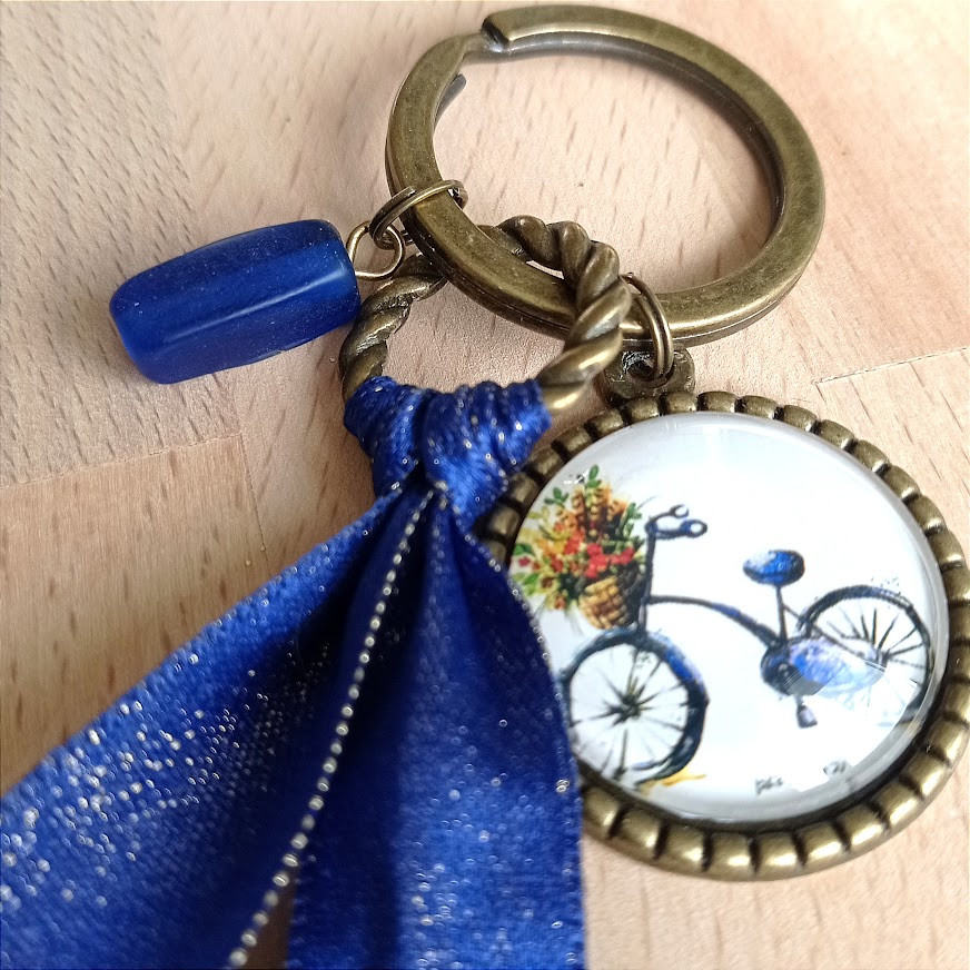 Joli bleu 'Klein' pour la perle de verre et le ruban satinée au fil doré...Bicyclette vintage au même ton pour le motif du cabochon (3 cm de diamètre)